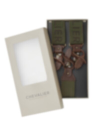 Chevalier Logo Suspenders är ett par breda och justerbara hängslen som fästs i byxorna med hjälp av metallspännen eller med knappfästen i äkta läder.