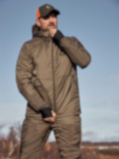 Thermo Fill140 Hood Jacket är en mångsidig och lätt jacka som kan användas både som ytterlager och som mellanlager. Vadderingen är följsam, mjuk och luftig vilket gör att man kan använda jackan som värmande lager under eller över en skaljacka beroende på aktivitetsnivå. Vid stillasittande jakt och kalla dagar kan Thermo jackan användas under din vanliga jaktjacka som ett isolerande lager. Vid rörlig jakt kan du med fördel ta på dig Thermo jackan utanpå din skaljacka för att hålla värmen och undvika avkylning i pauser och stillasittande situationer. Den här vadderade jackan är till största delen tillverkad av återvunna material i polyamid och polyester. Materialen är snabbtorkande och vadden värmer även om plagget blivit fuktigt. Jackan har två rejäla fleecefordrade framfickor med dragkedja. Inuti finns en dragkedjeförsedd innerficka för förvaring av nycklar och mobil samt två öppna förvaringsfickor för vantar och mössa. Tvåvägsdragkedja framtill för ventilation och rörlighet. En tryckknapp i fållen framtill håller jackans framstycken på plats även om dragkedjan fram öppnas för ventilation. Jackan har ett extra lager förstärkningsmaterial på axelpartier och i ärmsluten. Den har också en rejäl huva med tvåvägsjustering som får huvan att sluta tätt kring huvudet, enkelt gjort med ett enhandsgrepp. Den är justerbar i fållen nedtill och ärmsluten har elastiska muddar med tumhål och en smart förlängningsfunktion som bidrar till extra rörlighet. Packas lätt i sin egen huva, lättviktsjackan tar då mindre plats i packningen och vaddens mjukhet gör att den kan användas som kudde. Vikt 560 g i storlek Medium.