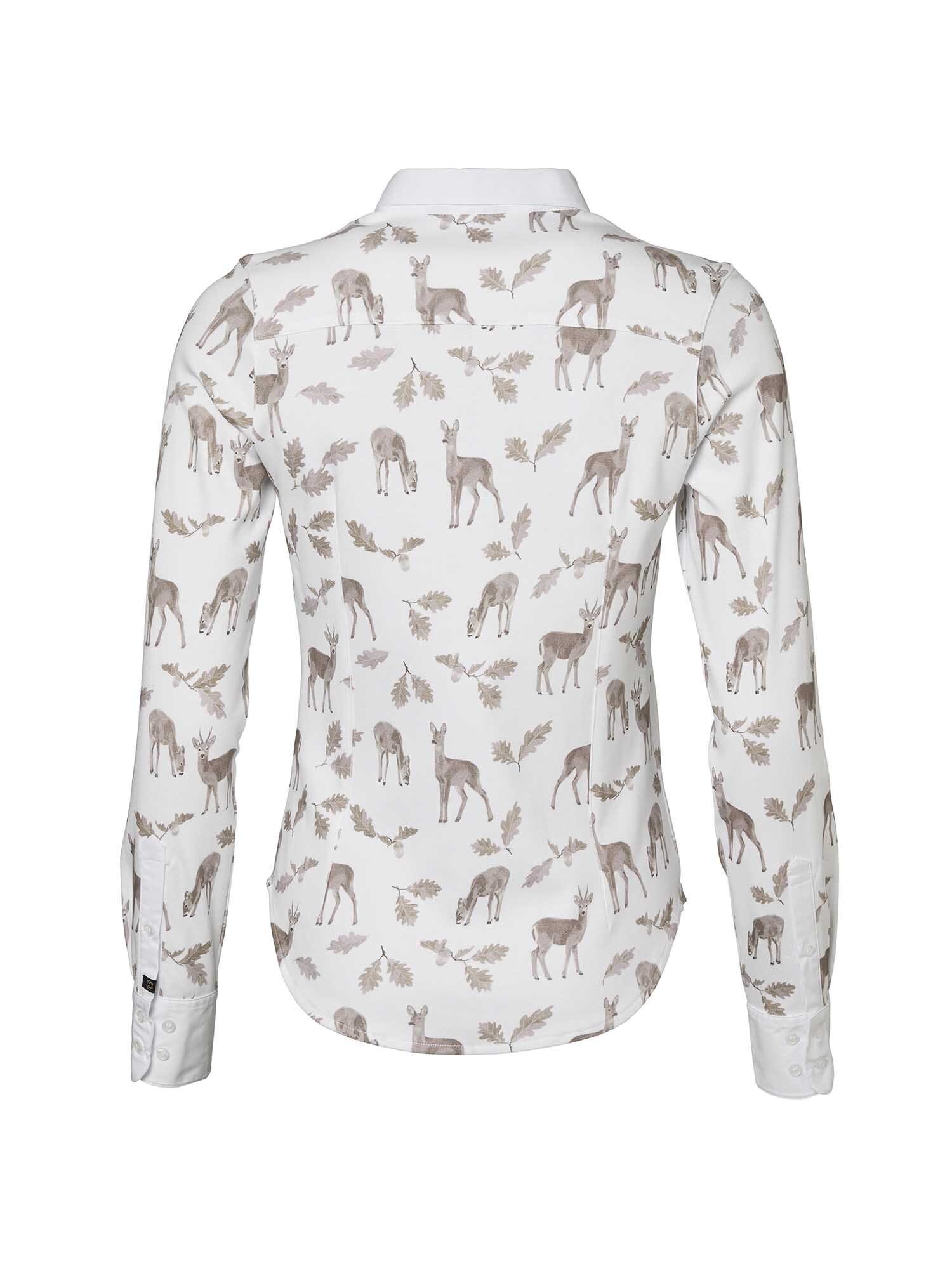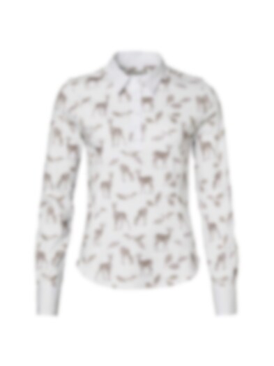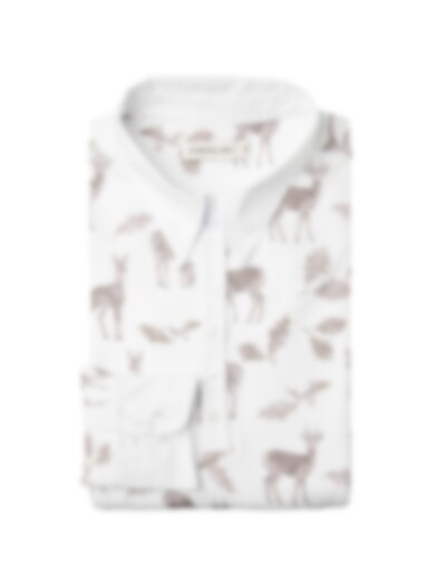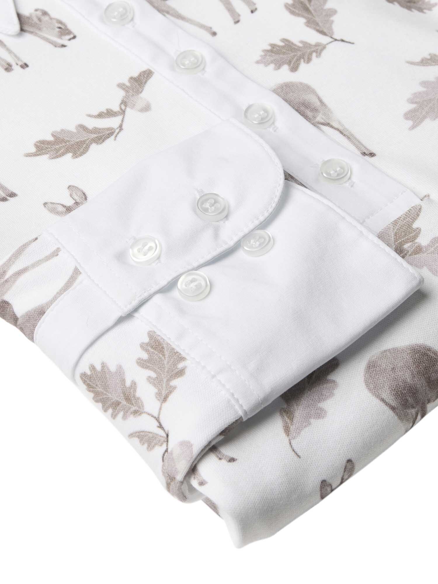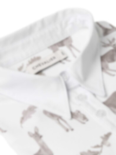 Skjortan är sydd i en högkvalitativ stretchig interlock jerseykvalitet av 100 % bomull, vilket ger en naturligt mjuk känsla mot huden samt skapar ett följsamt plagg. Skjortan har en contemporary fit med något insvängd midja, som skapar en smickrande siluett utan att kännas tajt. En fin detalj är den kontrasterande vävda knappslån – som ger ett ledigt men ändå dressat intryck. Ärmsluten är försedda med skjortmanschetter vilket ger en skräddad känsla. Skjortan har ett unikt Chevalier-tryck och detaljer i kontrasterande tyg, vilket ger ett lyxigt och stilrent uttryck. Funktioner och detaljer: